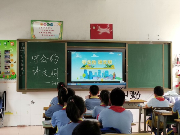 6月,學校利用校門口和操場的LED顯示屏,滾動播放文明公約等宣傳口號,在同學們心中播種文明種子;并在周一早上的升旗儀式,開展國旗下講話活動,對學生進行創(chuàng)文教育。近日,學校還在各班開展了“踐行文明公約,爭做文明小公民”主題班會和觀看宣傳片活動。班主任們結合宣傳片和《市民公約》,對學生進行了思想道德、文明禮儀、科普等方面知識教育,解釋了《市民文明公約》的重要性和意義。