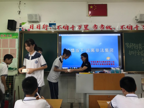各年級(jí)響應(yīng)號(hào)召,積極開展了以“拒絕高利誘惑、遠(yuǎn)離非法集資”主題班會(huì),各班以播放由廣東省處置非法集資領(lǐng)導(dǎo)小組、廣東省地方金融監(jiān)督管理局錄制的宣傳教育視頻——“珍惜當(dāng)下 遠(yuǎn)離非法集資”開場,旨在通過生動(dòng)形象的案例畫面讓學(xué)生初步建立對“非法集資”的認(rèn)識(shí)。同學(xué)們通過閱讀非法集資的宣傳單張,進(jìn)一步了解了如何辨別非法集資,如何避開非法集資陷阱等知識(shí),同學(xué)們紛紛表示要堅(jiān)決抵制高額回報(bào)的誘惑,不貪小便宜,切實(shí)做到不接受各類非法集資的傳單,不散布非法集資的信息。同時(shí),為了檢驗(yàn)此次活動(dòng)的宣傳效果,各班還開展了“非法集資”有獎(jiǎng)問答、“非法集資”即興演講等活動(dòng),充分調(diào)動(dòng)學(xué)生參與積極性。