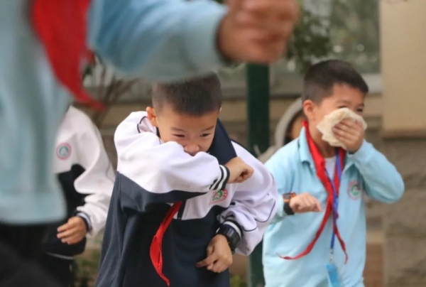 當(dāng)天上午8點(diǎn)45,樓道濃煙滾滾,刺耳的警鈴聲響起,學(xué)生們在老師的組織下,迅速把毛巾打濕、捂住口鼻,以最快的速度有序地從通道口撤離“火災(zāi)”現(xiàn)場。