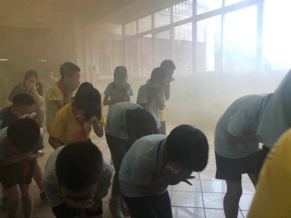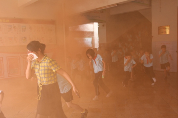 上午8點(diǎn)55分,各樓層突然濃煙滾滾,刺耳的警報(bào)聲響徹校園,這是沒有提前通知學(xué)生的演練,此時(shí),全校同學(xué)們?cè)诳迫卫蠋煹慕M織下,迅速打濕毛巾,捂住口鼻,彎腰,有序撤離危險(xiǎn)區(qū)域,迅速到達(dá)操場(chǎng)的安全地帶,所有在辦公室的老師也積極到現(xiàn)場(chǎng)指揮學(xué)生疏散,整個(gè)活動(dòng)井然有序。到達(dá)操場(chǎng)后,各班班主任和科任老師清點(diǎn)人數(shù),并層層上報(bào),通過兩次的演練,在短短的兩分鐘多鐘,全校師生全部安全疏散完畢。