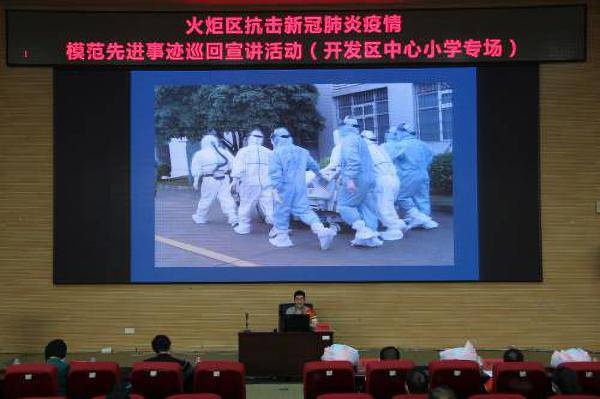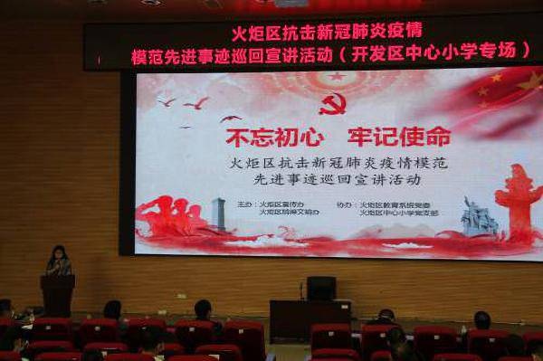 為大力宣傳開發(fā)區(qū)疫情防控斗爭中涌現(xiàn)出的“抗疫先鋒”光榮事跡,弘揚(yáng)主動擔(dān)當(dāng)?shù)暮迫徽龤夂蜔o私奉獻(xiàn)的高尚精神,厚植廣大師生愛國主義和家國情懷,6月24日上午9點(diǎn),開發(fā)區(qū)抗擊新冠肺炎疫情模范先進(jìn)事例宣講活動在開發(fā)區(qū)中心小學(xué)學(xué)術(shù)報告廳開展,區(qū)宣傳辦韓永、區(qū)教育事務(wù)指導(dǎo)中心副主任關(guān)影紅、開發(fā)區(qū)中心小學(xué)副校長劉剛毅、副校長孫寧、全體黨員教師、學(xué)生代表以及區(qū)內(nèi)各兄弟學(xué)校教師代表共計有130余人參加此次活動。