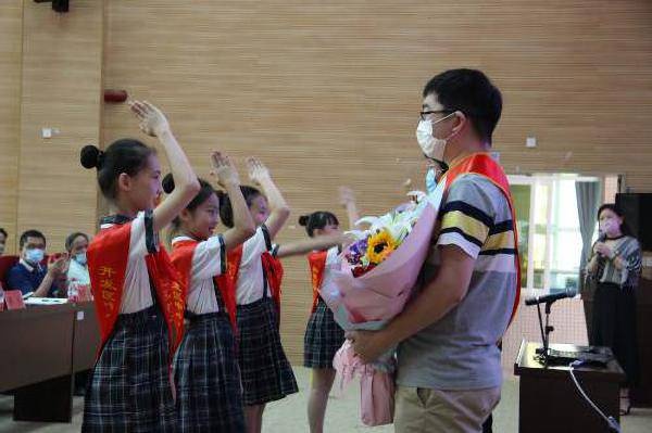 活動由德育與個性發(fā)展室主任汪湄主持,五位“抗疫先鋒”分別為開發(fā)區(qū)公安局民警鄧舜、開發(fā)區(qū)醫(yī)院醫(yī)生劉錦明、美味鮮食品有限公司后勤部負(fù)責(zé)人楊巧萍、開發(fā)區(qū)疾控中心工作人員黃俊陽和開發(fā)區(qū)文體宣傳中心工作人員吳飛飛。在主持人進(jìn)行簡單介紹后,少先隊員代表為他們獻(xiàn)花和綬帶。隨后,鄧舜同志首先分享如何帶領(lǐng)無人機(jī)作戰(zhàn)小組開展疫情宣傳及防控工作。劉錦明同志以“2020年,我的戰(zhàn)‘疫’日記”為主題,分享作為中山市新冠肺炎重癥治療專家組成員面對病人如何與病毒較量,為生命站崗。楊巧萍同志的先進(jìn)事跡為主動請纓投入一線戰(zhàn)疫確保了集體和廣大群眾的民生保障。曹俊陽同志帶領(lǐng)同事們做好各項疫情防控工作,為市民群眾提供精準(zhǔn)的科學(xué)就醫(yī)和防護(hù)指導(dǎo)。吳飛飛同志分享了自己在武漢作為社區(qū)抗疫志愿者的日常工作?!翱挂呦蠕h”的先進(jìn)事跡,彰顯了疫情背景下為國為民主動擔(dān)當(dāng)?shù)母呱星閼??;顒幼詈螅翱挂呦蠕h”與師生合影留念。