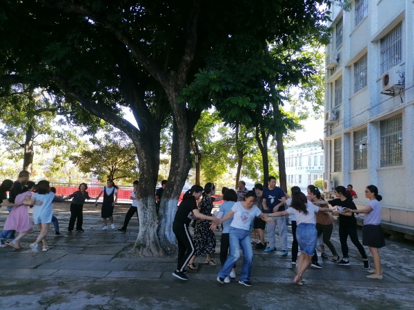 在心理老師的帶領(lǐng)下,活動(dòng)開始。熱身活動(dòng)“桃花朵朵開”營造了輕松歡快的氣氛;“大兵步操”活躍氣氛,同時(shí)讓教師們打破疫情下諸多新規(guī)帶來的不確定感;“為自己鼓掌”讓教師在自我挑戰(zhàn)中樹立信心;“劃拳接力賽”進(jìn)一步激發(fā)了教師們的熱情,釋放了壓力,使活動(dòng)達(dá)到高潮;最后,全體教師圍成一圈進(jìn)行總結(jié)分享,感染彼此的生命活力,增強(qiáng)了團(tuán)隊(duì)凝聚力。