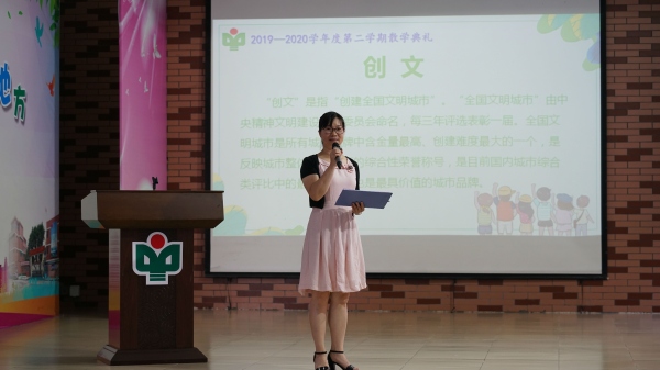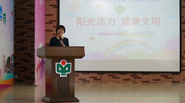典禮的第二個(gè)環(huán)節(jié)是由鄭結(jié)霞校長做學(xué)期總結(jié)發(fā)言。2020年是特殊的一年,因此鄭結(jié)霞校長帶來了主題為《平安伴我行,快樂過暑假》的講話。鄭結(jié)霞校長首先向孩子們普及防控知識(shí),提醒同學(xué)們?cè)诩倨谥校M量避免前往疫情發(fā)生的區(qū)域,遵守“少出門、少聚集、戴口罩、勤洗手、勤通風(fēng)”的原則,保持個(gè)人和居家的清潔衛(wèi)生;接著,鄭結(jié)霞校長從防溺水、交通安全和居家安全等多方面跟孩子們進(jìn)行安全教育,并鼓勵(lì)孩子們要多進(jìn)行體育鍛煉;最后,鄭結(jié)霞校長號(hào)召孩子們以主人翁的精神,從自己做起,從現(xiàn)在做起,從言行舉止的細(xì)微之處做起,樹立環(huán)保意識(shí),保持環(huán)境整潔,說文明話、辦文明事、做文明人。