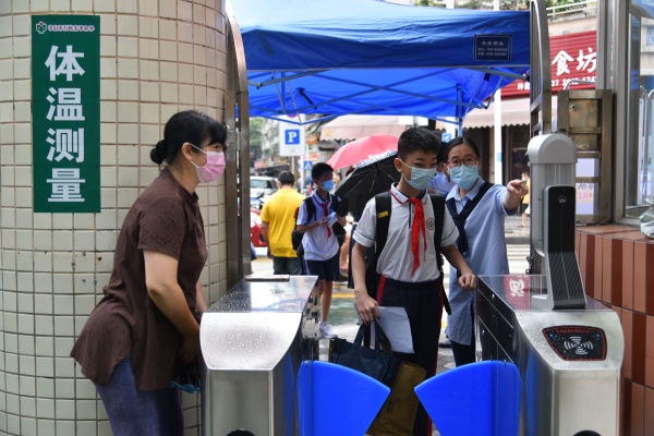 早上7:15分,學校行政、值日老師、家長護衛(wèi)隊及蓮峰派出所警察叔叔們,早早地在校門口熱切地等候著返校的師生們。7:20分開始,學生有序地按學校錯峰安排陸續(xù)返校,盡管隔著口罩,也能感受到同學們按奈不住的喜悅之情。在老師的引導下,同學們以1米間距排隊,依次檢查復學碼和承諾書,通過體溫檢測等防疫步驟后才進入校園,把好入校安全第一關。四至六年級273名學生,全都順利返校。