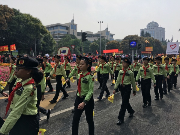 仙小少年軍校領(lǐng)袖團(tuán)代表中山市少先隊(duì)工作委員會(huì)及中山市少先隊(duì)特色社團(tuán)參加團(tuán)市委游行方隊(duì),他們身穿訓(xùn)練服,精神抖擻、意氣風(fēng)發(fā),大步走在大道上,不時(shí)高喊習(xí)總書記對(duì)全國少先隊(duì)員的寄語“從小學(xué)習(xí)做人,從小學(xué)習(xí)立志,從小學(xué)習(xí)創(chuàng)造”,受到了圍觀群眾的熱烈喝彩。