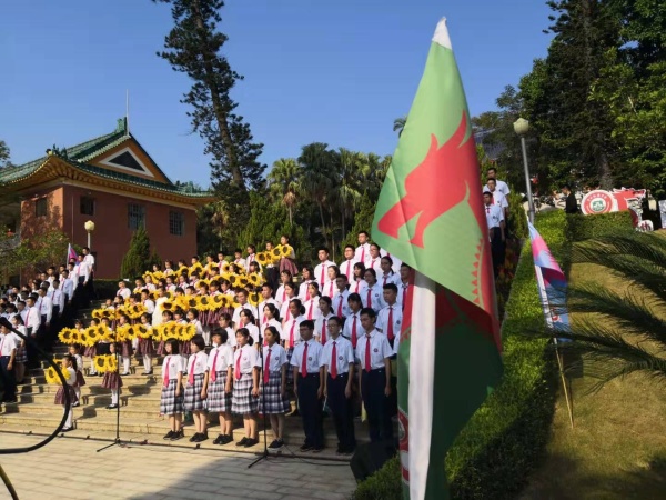 當天晴空萬里,空氣清新。石岐第一小學(xué)的陽光天使合唱團40名小演員們在鄂艷霞校長的帶領(lǐng)下,穿著整齊的校服,戴著鮮艷的紅領(lǐng)巾,早早就來到了紀念中學(xué)的校園里等候活動的開始。上午九點,在紀念中學(xué)的民國建筑群漢白玉雕像前,一臺精彩的文藝表演拉開了校慶活動的序幕。石岐第一小學(xué)的陽光天使合唱團和紀中合唱團的大哥哥、大姐姐一起唱起了由著名作曲家李海鷹寫的《我們的孫中山》,美妙的歌聲在紀念中學(xué)的上空飄響:五桂山下,蘭溪河畔,原野飄香宛如天堂,翠亨村曉醒來的阡陌上,走過來一個人——我們的孫中山。走過多少路,名字叫中山,條條中山路都通往四方,飛越大海聯(lián)結(jié)中國心,世界的孫中山,我們的孫中山。