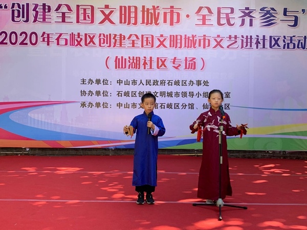 為了助推中山市創(chuàng)建全國(guó)文明城市的建設(shè)工作,提高群眾對(duì)創(chuàng)文的知曉率,讓創(chuàng)文工作深入人心,引導(dǎo)廣大人民群眾當(dāng)好創(chuàng)文活動(dòng)的宣傳者、參與者,由中山市人民政府石岐區(qū)辦事處主辦、石岐區(qū)創(chuàng)建文明城市領(lǐng)導(dǎo)小組辦公室協(xié)辦、中山市文化館石岐區(qū)分館、仙湖社區(qū)承辦的“創(chuàng)建全國(guó)文明城市?全民齊參與”文藝進(jìn)社區(qū)活動(dòng)于2020年7月23日上午9:00-11:30在仙湖正街的健身公園成功舉辦,石岐高家基小學(xué)積極參與此次文藝進(jìn)社區(qū)活動(dòng),為附近居民群眾獻(xiàn)上精彩的文藝演出。