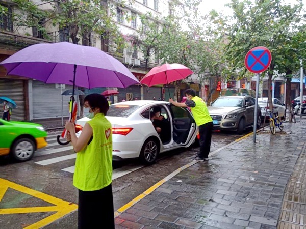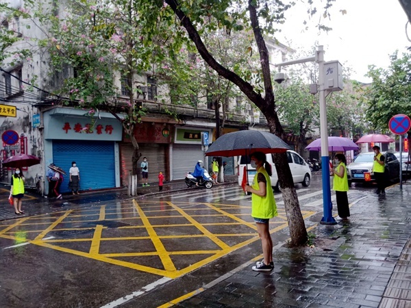 強(qiáng)對(duì)流天氣帶來(lái)短暫性暴雨,學(xué)校護(hù)衛(wèi)隊(duì)堅(jiān)守崗位,開始第一天的護(hù)校工作。為了保障順利開學(xué),早上6:50他們就早早來(lái)到高家基巷口,換好值日服裝,戴上防護(hù)手套,開始晨間工作。他們兵分多路,有的在路口疏導(dǎo)交通,有的引導(dǎo)家長(zhǎng)有序停車,還有的護(hù)送學(xué)生過(guò)馬路。他們?nèi)藬?shù)不多,但是分工明確:一部分是負(fù)責(zé)協(xié)助路邊下車的學(xué)生,攔停機(jī)動(dòng)車道車輛,以確保自身安全及學(xué)生能安全通行;另一部分是負(fù)責(zé)開關(guān)私家車車門,接送學(xué)生,以免造成道路擁堵。并且,由于在疫情期間,護(hù)衛(wèi)隊(duì)隊(duì)長(zhǎng)特別強(qiáng)調(diào):“所有隊(duì)員在值崗過(guò)程中不能觸碰學(xué)生及學(xué)生物品,人與人間保持至少1米以上安全距離,戴一次性手套?!边@一個(gè)個(gè)細(xì)節(jié)展示了學(xué)校護(hù)衛(wèi)隊(duì)工作的細(xì)致、認(rèn)真和用心。
