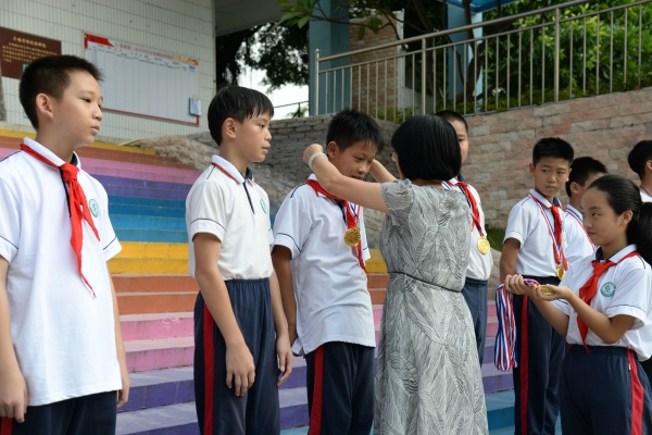 在莊嚴(yán)的升旗儀式后,六(4)班以“教師禮贊”為主題的詩歌朗誦拉開了活動的序幕。六(3)班的學(xué)生也用優(yōu)美、整齊的手語舞《感恩的心》表達(dá)了對老師的深深敬意和濃濃的愛。接著,兩個班的學(xué)生代表向?qū)W校的全體老師送上了鮮花和節(jié)日的祝福,收到了這份驚喜的老師臉上都洋溢著幸福的笑容。隨后,李振華副校長呼吁全體師生共同迎接第35個教師節(jié),讓濃濃的尊師情溢滿校園。最后,吳海棠主任對暑假參加2019年廣東省門球錦標(biāo)賽的獲獎學(xué)生進(jìn)行表彰及頒獎,充分肯定了選手積極進(jìn)取和拼搏奮斗的精神,也寄望新隊員要刻苦訓(xùn)練再創(chuàng)輝煌。