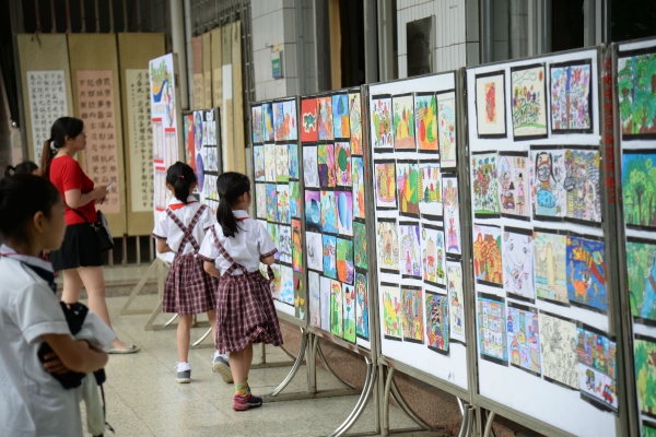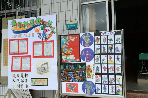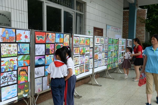 本次書畫展,由美術科組精心策劃和布置,展示了師生良好的藝術素養(yǎng)和積極向上的精神風貌。展覽作品涵蓋水粉、彩鉛、兒童畫、手工畫、書法等不同類型作品,每幅作品都真切地體現(xiàn)師生對美的追求、對藝術的探索和對美好生活的向往。書法蘊含著中國傳統(tǒng)文化的精髓,承載著中國文化的審美志趣。書畫展上,展示了戴織、古運迎、陳月英、何雪芳、李桂華、劉燕青、肖湘霞、胡竹軍等部分教師的優(yōu)秀書畫作品。書畫習作活動的開展,為教師們展現(xiàn)才藝、相互學習、共同成長提供了良好的平臺,有效地促進了教師對教學的思考。其次,展出的學生作品都來自平時的美術課堂和社團成果,不同的年齡段學生藝術表現(xiàn)手法也不同。學生作品展板上,一件件風格迥異的作品皆反映出學生內心奇異世界。孩子們是在用心靈作畫,以獨特的視角再現(xiàn)美好生活;用情感寫意,以純真的熱情展現(xiàn)個人風采。
