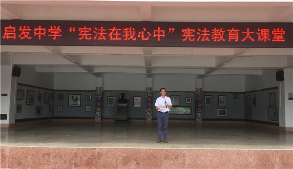 2019年5月20日,啟發(fā)中學(xué)在學(xué)校操場(chǎng)利用國(guó)旗下講話時(shí)間舉行了“憲法在我心中”憲法教育大課堂法治宣傳教育活動(dòng),隨后通過(guò)主題班會(huì)以及道德與法治課進(jìn)行了深化教育。