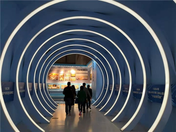 展覽以時(shí)間為線索,按照中山改革開(kāi)放歷史發(fā)展分為五個(gè)階段:第一部分“解放思想 探索發(fā)展(1978—1983)”、第二部分“先行先試 創(chuàng)新發(fā)展(1983—1992)”、第三部分“找準(zhǔn)定位 特色發(fā)展(1992—2002)”、第四部分“轉(zhuǎn)型升級(jí) 科學(xué)發(fā)展(2002—2012)”、第五部分“五位一體 全面發(fā)展(2012—至今)”。其中令人眼前一亮的是一條由諸多圓形燈帶組成、名為“跨入新世紀(jì)”的蔚藍(lán)時(shí)空隧道。燈帶之間從1976年的“里溪探索推行‘聯(lián)產(chǎn)到勞’”,到2017年的“發(fā)力粵港澳大灣區(qū)建設(shè)”,既醒目又一目了然,展現(xiàn)中山時(shí)代變遷。