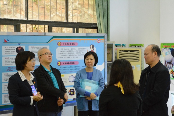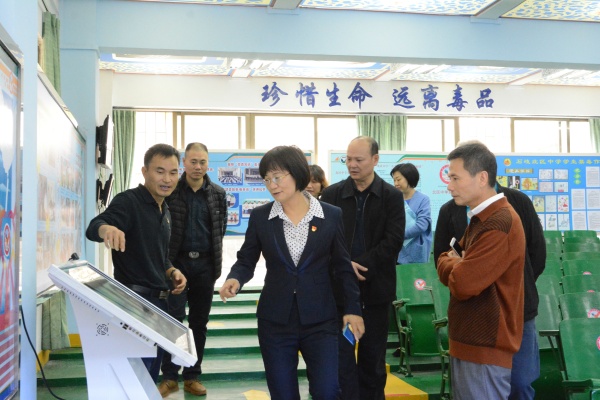 在趙翠顏校長(zhǎng)的帶領(lǐng)下,考察團(tuán)各位領(lǐng)導(dǎo)饒有興致地參觀了禁毒基地。在毒品標(biāo)本柜前,領(lǐng)導(dǎo)們駐足觀看,各式各樣的新型毒品模型,引起他們的深思和驚嘆;在禁毒展板前,禁毒感言、禁毒LOGO設(shè)計(jì)、禁毒漫畫(huà)、禁毒歌謠、禁毒誓詞和禁毒微劇本等,充分調(diào)動(dòng)家長(zhǎng)和師生參與禁毒活動(dòng)的積極性,開(kāi)啟“禁毒在體驗(yàn)、禁毒在參與、禁毒在創(chuàng)作”的教育之路;在多媒體互動(dòng)區(qū)域,禁毒網(wǎng)絡(luò)游戲闖關(guān)、吸毒后人臉變化系統(tǒng)吸引了不少來(lái)賓的注意,他們實(shí)地體驗(yàn),認(rèn)為充滿(mǎn)趣味的互動(dòng)讓毒品預(yù)防教育及普及青少年法治知識(shí)變得更加容易。