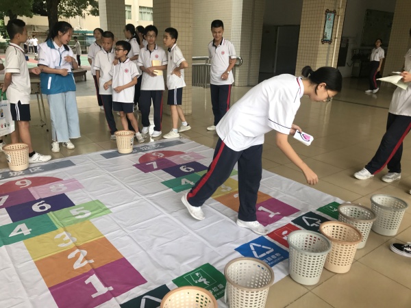 “實踐是檢驗真理的唯一標準”,為了讓學生真正的參與到實踐中來,學生們在空架層進行了“垃圾分類進課堂”游園活動,活動現場設置了如“垃圾分類投放模擬游戲”、“投籃”、“拼圖”、“跳飛機”和“抓沙包”等系列垃圾分類主題游戲攤位,供學生們體驗游玩。學生積極參與,并樂在其中,通過游戲的方式,加深學生對垃圾分類的認識。