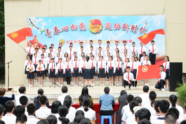 活動(dòng)的第二個(gè)環(huán)節(jié)是學(xué)校本學(xué)期發(fā)展的新團(tuán)員和初二團(tuán)支書合唱團(tuán)歌《光榮??!中國(guó)共青團(tuán)》,由初三3班吳昱瑤同學(xué)領(lǐng)唱?!啊逅摹幕鹁?,喚起了民族的覺(jué)醒。壯麗的事業(yè),激勵(lì)著我們繼往開來(lái)。”北中的團(tuán)員們用激昂的歌聲,點(diǎn)燃了全場(chǎng)的氣氛,也拉開發(fā)合唱比賽的序幕。