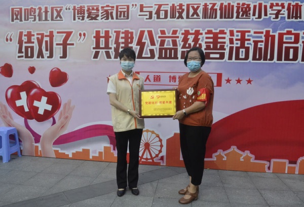 隨后,鳳鳴社區(qū)黨委向楊仙逸小學體育路學校黨支部贈送“黨建結(jié)對,博愛共建”紀念牌匾,參與活動的領導嘉賓向各班級班主任頒發(fā)“結(jié)對子”關愛牌。全體人員合影留念,正式為本次公益慈善活動按下“啟動”鍵。