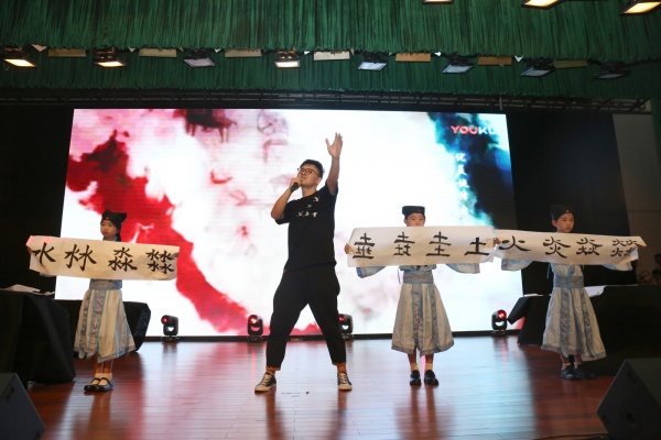 頒獎結束后,田中陽老師隨著音樂的響起,從體育館最后一排邊走邊唱起了網紅歌曲《生僻字》,并與學生及家長揮手致意,動感的旋律瞬間燃爆全場!學生、家長、老師們在這熱烈的氣氛中,感受著“六一”快樂。舞臺上四位同學揮豪潑墨,一曲終了,同學們筆下的幾個生僻字的書法作品也展現(xiàn)在舞臺上:火炎焱燚、水沝淼?……