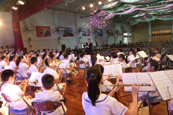 主持人在一片掌聲中登上舞臺,同學們期待已久的文藝演出開始了!聲勢浩大的管樂大合奏《Wingsongs》、《踏浪》拉開了文藝演出的序幕。在落英繽紛、如夢如幻的舞臺背景下,小演奏家們在李鴻鍔老師的指揮下,熟練而深情地演奏著。那歡快的樂聲仿佛將觀眾們帶到了碧海黃沙之境,讓人流連忘返。