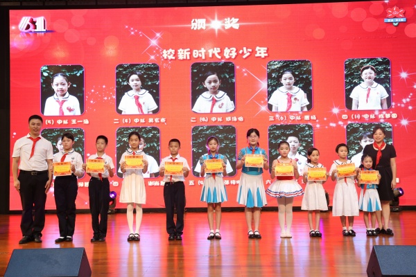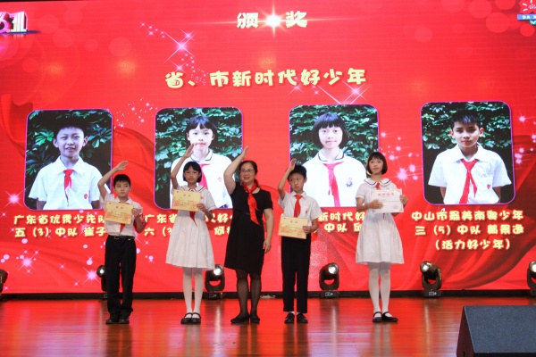 緊接著,孫慧濤主任主持了表彰大會。首先,團市委學校部部長羅必立先生向學校頒發(fā)了“全國優(yōu)秀少先隊集體”獎狀,然后是梁校長為崔子傲(廣東省優(yōu)秀少先隊員)、何梓瑜(廣東省新時代好少年)、黃景逸(中山市最美南粵少年)、邱丹蘊(中山市新時代好少年)等四位隊員頒發(fā)了相應獎狀;馮冠祥副校長、蔡潔珊女士為黎桂芳等17位榮獲校“優(yōu)秀輔導員”稱號的教師頒發(fā)了獎狀,表彰她們在過去的一年中帶領著各自中隊腳踏實地,勇創(chuàng)佳績。梁鐘添副校長、杜少君副校長為六(1)中隊等18個榮獲?!凹t旗中隊”稱號的中隊頒獎;羅必立部長、梁校長、馮校長、蔡潔珊女士為全校48個中隊的優(yōu)秀客座教師、好家長代表頒獎,石麗文主任、崔士強副主任、于海洋副主任、譚志凌副主任為校新時代好少年和其他獎項代表頒獎。在場的老師、同學和家長們對獲獎教師和同學們報以長時間的熱烈掌聲,表達著祝賀,也表達著向榜樣學習的決心。