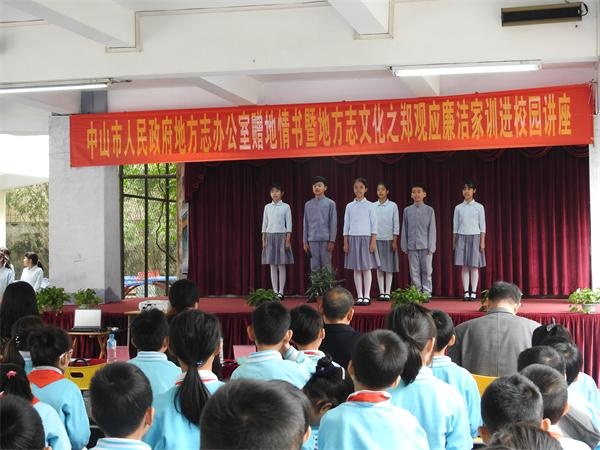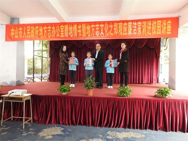 2018年11月28日上午,中山市人民政府地方志辦公室在博愛(ài)小學(xué)舉行中山地方志辦公室地情書(shū)贈(zèng)送儀式暨地方志文化之鄭觀應(yīng)廉潔家訓(xùn)進(jìn)學(xué)校普及講座,中山市地方志辦,市鄭觀應(yīng)文化學(xué)會(huì)長(zhǎng)吳冉彬、副會(huì)長(zhǎng)匡和平,副秘書(shū)長(zhǎng)羅淑怡等領(lǐng)導(dǎo)出席此活動(dòng)。