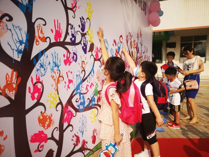 早上,滿懷興奮與期待的新生和家長(zhǎng)們用熱情喚醒了校園,五小的老師們也早早地站在校門(mén)口迎接小朋友們。孩子和家長(zhǎng)們走在紅地毯上穿過(guò)樂(lè)學(xué)門(mén),在“夢(mèng)想樹(shù)”的樹(shù)枝上留下了自己的小手掌印,一個(gè)個(gè)五彩斑斕的小手掌印仿佛滿樹(shù)碩果掛滿枝頭。