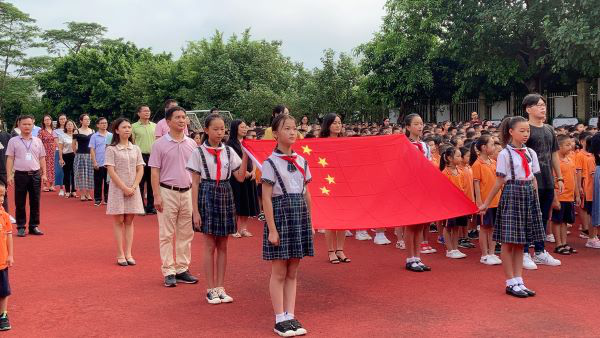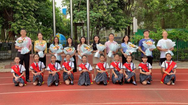 首先,全體師生舉行莊嚴的升旗儀式?,F(xiàn)場,全體肅立,伴隨著雄壯的國歌聲,五星紅旗冉冉升起。學(xué)校禮儀隊的少先隊員們?yōu)榻處煷慝I花。來自一至六年級級組、藝術(shù)科組、體育科組、綜合科組、行政組共10名教師代表接受獻花。來自四(2)班的優(yōu)秀少先隊員代表陳泳霖同學(xué)致辭,表達對全體教師感激之情。最后,全體同學(xué)齊唱《聽我說謝謝你》。當2800余名孩子們用稚嫩的聲音齊聲高唱“你是我的天使,一路指引我,無論歲月變幻,愛你唱成歌。聽我說謝謝你,因為有你,溫暖了四季……”溫情的歌聲傳達著孩子們對老師諄諄教誨的無限感激。在這無限感動的一刻,眼眶濕潤著的老師們感到了為人師者的莊重與神圣,欣慰與幸福。