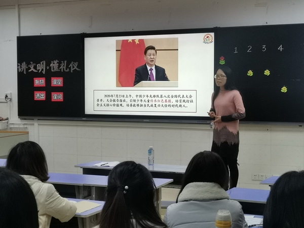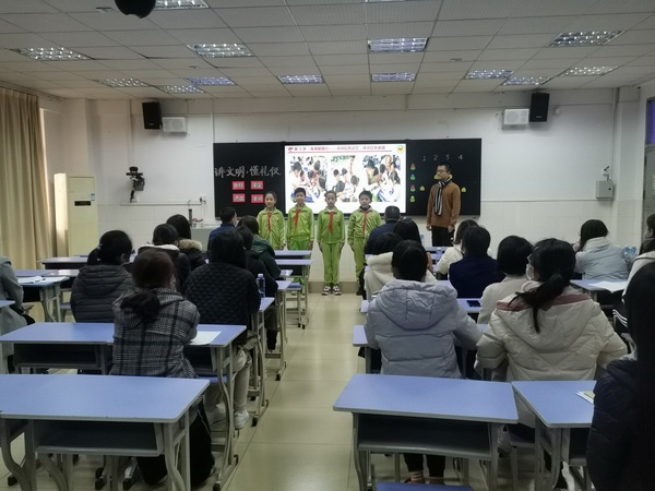 活動一開始,香暉園小學(xué)“螢火蟲”工作室成員孫嘉優(yōu)老師攜同一(2)班的孩子們?yōu)榇蠹規(guī)砹税鄷n《講文明,懂禮儀》,孫老師用富有感染力的語言,結(jié)合孩子生活實際,從課間、升旗、進出辦公室等方面讓同學(xué)們明白了“講文明,懂禮儀”的重要性。隨后,該校陳澤湖校長為黃圃新地中心小學(xué)的同仁們介紹了學(xué)校的關(guān)懷教育理念,陳校長從學(xué)校的核心追求到培養(yǎng)目標,從辦學(xué)目標到校風學(xué)風作了詳細的講解,在座嘉賓不時點頭表示認同。緊接著,該校周溫馳老師和五6班學(xué)生代表為大家分享了“勇于擔當肩負使命,勤奮自律踐行愛國”小啟超特色班創(chuàng)建歷程,何小蘭老師為大家展示了《尋訪拳拳中國心,爭做火炬“小紅人”》的少先隊活動說課。新地中心小學(xué)的老師們紛紛表示:香暉園小學(xué)展示的這些活動給他們開展班主任工作提供了范例,是他們學(xué)習的榜樣。