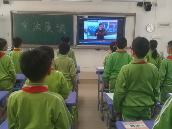 憲法日當(dāng)天早上,學(xué)校組織各班級(jí)開(kāi)展了“讀憲法、學(xué)憲法、懂憲法、爭(zhēng)做守法小公民”主題學(xué)習(xí)活動(dòng)。全體學(xué)生在老師的帶領(lǐng)下觀看教育部在北京舉辦的“憲法晨讀”活動(dòng),并學(xué)習(xí)了《中華人民共和國(guó)憲法》第一條、第二條、第五條……第四十六條、第五十四條等重要內(nèi)容。在各班主任老師的領(lǐng)誦下,伴隨著朗朗的誦讀聲,師生們深深地感受到憲法作為國(guó)家根本大法的神圣不可侵犯性。