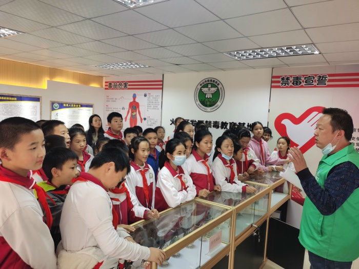 在禁毒教育基地工作的社工化身為講解員,為學生們講解了毒品的歷史、毒品的危害和相關(guān)法律知識。學生們認真聆聽,不時與講解員進行互動。在基地工作人員的指引及介紹下,學生們通過觀看手抄報、實物、圖片和講解真實的案例等方式,直觀地把毒品的危害展現(xiàn)在面前,使每位學生清晰深刻地了解到毒品的本質(zhì)、毒品給人類和社會帶來的危害,深刻認識到毒品不僅是一把殺人不見血的刀,也是一條緊勒咽喉的繩,還是一盞導向“死?!钡臒?。