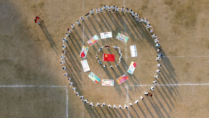 隨后,活動以主題明確而又接地氣的百人繪畫的形式生動活潑地展現(xiàn)了十九屆五中全會內(nèi)容的精神,同學們的繪畫有的寫實,有的對祖國未來前景的想象,繪畫材料多樣。期間,火炬二中張慧暖,魏利華,胡幸余三位藝術老師在一旁作指導。他們充分尊重學生個性,讓學生自由發(fā)揮,同時也參與到繪制中來。此外,活動還以青少年喜聞樂見的航拍、標語創(chuàng)意造型拍、視頻拍攝等形式鞏固學習內(nèi)容,讓活動成效進一步延伸至全校師生。