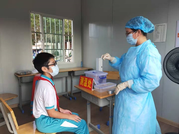 演練內(nèi)容為學(xué)生在校門口測溫發(fā)現(xiàn)異常及應(yīng)急處置。在演練中,學(xué)生間隔一米排隊入園。進班前由班主任對所在班級學(xué)生進行晨午檢,并做好晨午檢記錄,病因追蹤報告及復(fù)課證明查驗等日常工作。在通過學(xué)校門口測溫時,測溫教師發(fā)現(xiàn)其中一名學(xué)生體溫異常,該教師立刻把該學(xué)生帶到臨時觀察點并讓校醫(yī)再次對該學(xué)生進行測溫。校醫(yī)水銀體溫計核實體溫,詢問并登記該生在14天內(nèi)有無疫情重點地區(qū)旅游史、途徑史,有無確診、疑似病例接觸史。囑咐家長到醫(yī)院就醫(yī)。隨后,學(xué)生被家長接回,后勤人員到觀察室進行消毒。通過各個小組的相互配合,演練有序進行,行動迅速,有效強化了師生安全意識和應(yīng)急避險及疏散能力。