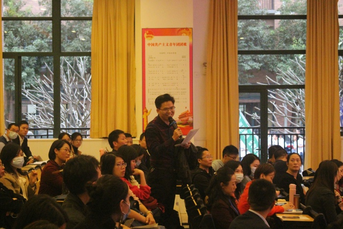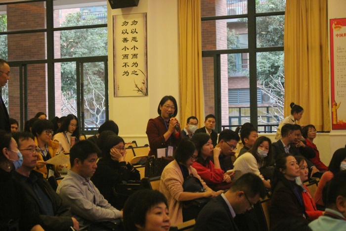 觀摩課結(jié)束,參會人員集中研討交流,汪和生副院長主持建議來自不同區(qū)的老師能自由點評一下。來自東莞、中山其他試點校的老師在肯定紀雅取得優(yōu)秀成果基礎(chǔ)上提出幾點疑惑,如小組合作學(xué)習(xí)的任務(wù)安排與效果評價,小組文化建設(shè)、班級文化建設(shè)中的德育與教學(xué)目標(biāo)怎么劃分,英語課如何用信息技術(shù)體現(xiàn)學(xué)生的思維。這些疑惑,王校長自信從容,結(jié)合紀雅的操作經(jīng)驗、現(xiàn)實做法,輕松地一一作了回答。