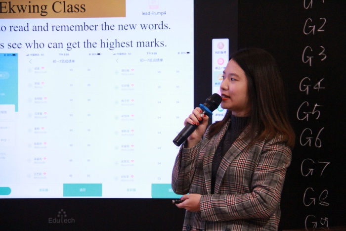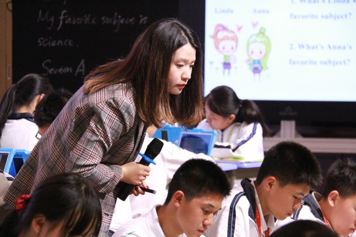 首先初一(7)班同學(xué)們齊聲面對大家先說了自己班級口號。下面的課程中,就不再聽到大家說中文了,真正做到英語課就從一始終用英文來交流。在課前的預(yù)習(xí)任務(wù)中,黎老師使用翼課網(wǎng)布置讀記單詞任務(wù),看誰識記最快。(所有上課任務(wù)都是實行加分的)上課開始,黎老師展示了學(xué)習(xí)目標(biāo)。而這堂課的內(nèi)容是:我最喜歡的學(xué)科和老師,所以先展示了同學(xué)們熟悉的各任課老師說英語的視頻,并用任課老師生活照片來提示大家用英文說科目名稱,讓學(xué)生一下就能融入學(xué)習(xí)任務(wù)與環(huán)境中。課中使用智慧課堂平臺發(fā)送(聽力)練習(xí)或發(fā)送做題任務(wù),學(xué)生拍照上傳答案,及時反饋做題結(jié)果,提高了課堂練習(xí)的效率。黎老師同樣十分注重小組合作,給學(xué)生創(chuàng)造語境,讓學(xué)生小組交流,兩人對話展示,說說自己最喜歡的科目與老師,以及理由??匆曨l,了解班上其它同學(xué)喜歡哪一位老師與科目。接著以小組合作的形式進行語言輸出,互相交流做調(diào)查,并選擇代表展示全組交流結(jié)果。不僅達到了本節(jié)課教育目標(biāo),同樣體現(xiàn)了學(xué)校特色,為英語課堂的技術(shù)融合提供了經(jīng)驗。7班、8班的孩子們在退場時,都能做到安靜、有序、有禮貌,體現(xiàn)了紀雅學(xué)子的素養(yǎng)。