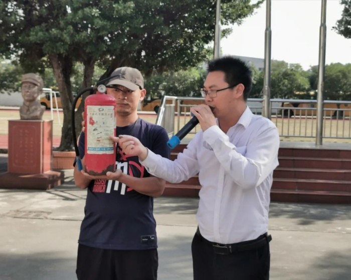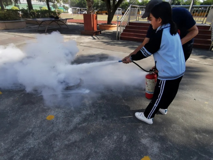 負(fù)責(zé)安全的俞希金老師非常仔細(xì)的向在場師生講解干粉滅火器的使用方法:“把滅火器罐上下晃動三次以上,將安全梢拉開,握住出粉皮管,將皮管朝向火點,距離火點2米左右用力壓下把手,對準(zhǔn)火苗根部噴射?!贝蠹叶祭卫斡涀×藴缁鹌鞯氖褂梅椒ā耙粨u、二拔、三噴”。隨后老師手把手的教學(xué)生使用干粉滅火器,滅火成功后,學(xué)生們臉上洋溢著成功的喜悅。