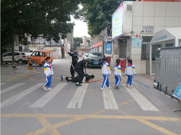 演練開始,早上7:30,學生上學期間,校門口最多學生的時候,一名“歹徒”突然沖向學生,這時,三小防暴組成員臨危不亂,一邊向學生發(fā)出警告并引導學生躲開,一邊履行自己的職責,手持鋼叉、盾牌、棍棒等,將“歹徒”圍住,最終成功制服“歹徒”,把師生受傷害程度降在最低限度。