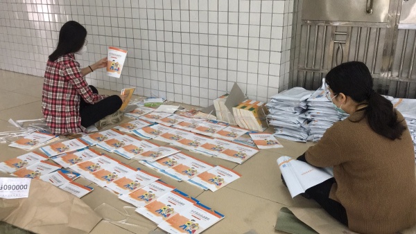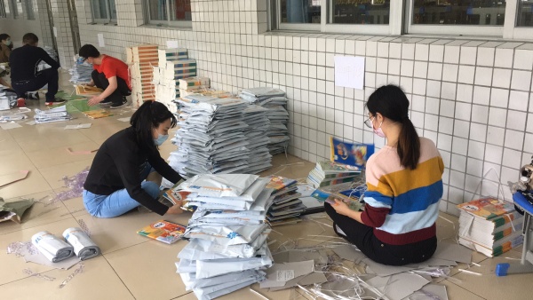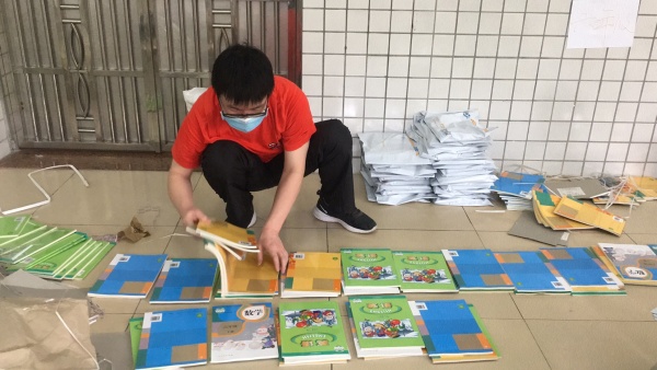 在這特殊時(shí)期,為了讓孩子們有書(shū)可讀,又避免聚集的風(fēng)險(xiǎn)。該校后勤部門(mén)確定使用“零接觸”的郵寄方式把新學(xué)期的課本送到每一位學(xué)生手中。迅速組織班主任做好每一位學(xué)生的信息登記、統(tǒng)計(jì),反復(fù)核對(duì)確保信息無(wú)誤。信息收集完畢后,幾位教師主動(dòng)承擔(dān)到校協(xié)助郵政人員按年級(jí)、班級(jí)、人員對(duì)書(shū)本進(jìn)行打包處理的任務(wù),以最快的速度確保學(xué)生的學(xué)習(xí)用書(shū)的到位。