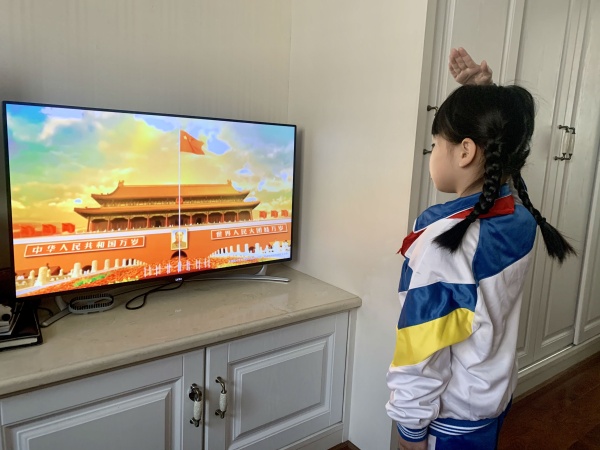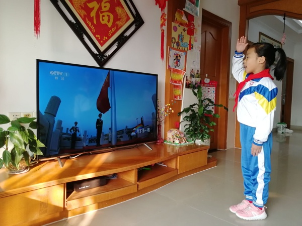 開學(xué)延遲,開發(fā)區(qū)第三小學(xué)的同學(xué)們對祖國的愛,不延時(shí)。當(dāng)天早上8:30,該校同學(xué)們在家里穿著整齊,佩戴紅領(lǐng)巾,在家中面向電視、電腦中直播的升國旗儀式肅立,聽指揮高唱國歌,少先隊(duì)員敬隊(duì)禮,其他人行注目禮?;顒幼詈?,全體同學(xué)們一起深情演唱歌曲《我的祖國》,讓愛國的種子在這個(gè)春天萌芽和蘇醒。