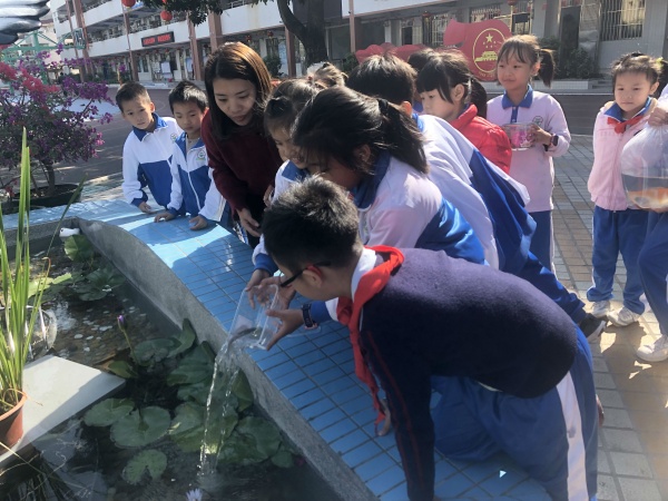 活動伊始,由少先隊輔導(dǎo)員阮結(jié)連老師向參加活動的師生代表講解了“班魚”入池活動的意義,并以現(xiàn)場提問互動的方式與學(xué)生交流。各班級學(xué)生向大家介紹了本班“班魚”的名字和品種。隨后,德育處阮雪屏主任宣布“班魚”入池儀式正式開始,各班級有序地向校園主體景觀“海闊憑魚躍”放入“班魚”?!皹窐贰薄ⅰ皩W(xué)學(xué)”、“四喜”等25條“班魚”正式成為五小的一份子,穿梭在清澈的池水里,一會休憩,一會玩耍,構(gòu)成了一幅生機勃勃的畫面。最后,五小德育處阮雪屏主任結(jié)合學(xué)校新建成的主題景觀對學(xué)生進(jìn)行“愛校愛班愛生”教育,并建議各班級成立“班魚”守護小組,把學(xué)生高度關(guān)注的素材作為德育的契機。