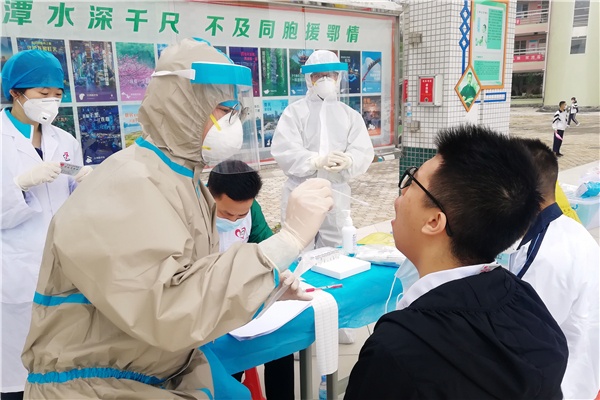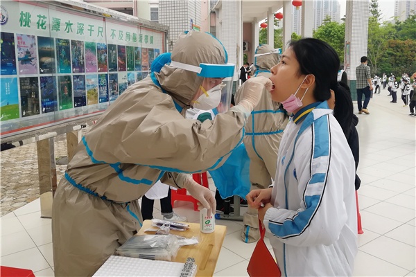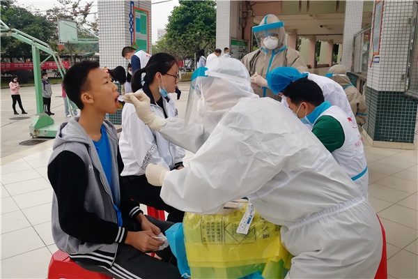 火炬區(qū)一中將自主文化廣場定為檢測場地,確保通風良好。受測學生從學校南門進入廣場,所有學生、工作人員進校前需做體溫篩查和查驗粵康碼,無粵康碼、非綠碼人員及體溫異常不可入校。檢測時要出示身份證或?qū)W生證(學籍號),需戴口罩。學校安排全程錄像?,F(xiàn)場共分15列縱隊檢測,至下午4時左右,市疾控中心的工作人員完成全部檢測任務(wù)。