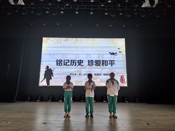 在氣勢軒昂的宣誓后,初一8班三位小演講者開始“勿忘國恥,振興中華”的演講。又是一年“九一八”,時間過去了整整88年,侵華日軍所犯下的罪行無法被時間抹去,中華民族的心靈創(chuàng)傷永不能安撫!華夏兒女必須要清楚牢記:銘記歷史,勿忘國殤。1931年9月18日,日本帝國主義發(fā)動了蓄謀已久的侵華戰(zhàn)爭,東北三省淪為日本帝國主義的殖民地,約三千萬中華兒女慘遭涂炭,陷于水深火熱之中。 中華民族經(jīng)歷過太多挫折才走到今天這一步,而我們——祖國未來的希望與棟梁,是要以自己的努力換取華夏民族在世界上的發(fā)言權(quán)!“讓中國站起來,立穩(wěn)足跟?!边@是我們努力的源頭與方向,重任擔(dān)在我們肩頭,唯有不斷超越自己努力學(xué)習(xí),將華夏兒女積極向上,朝氣蓬勃的精神完全散發(fā)出來,才能早日實現(xiàn)中華民族偉大復(fù)興。
