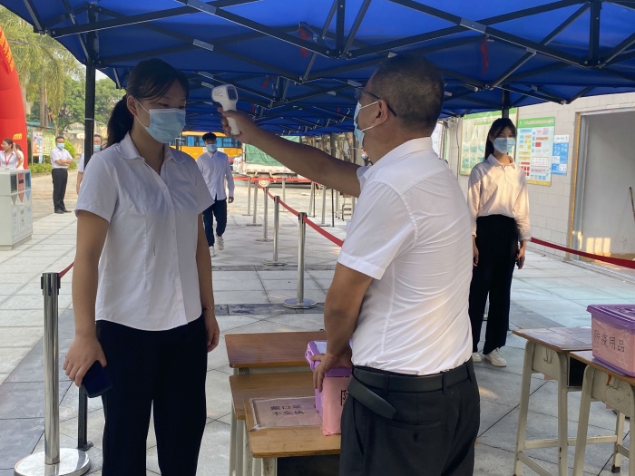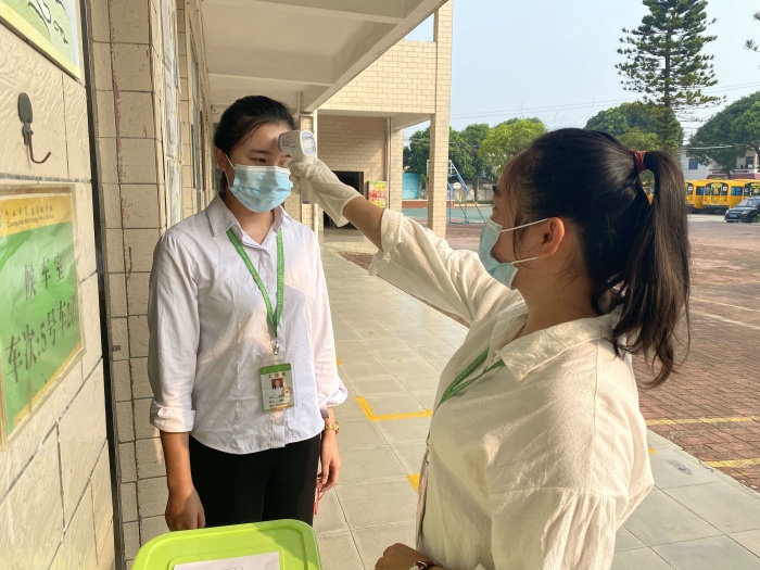 上午10點整,演練正式開始。一群由班主任扮演學(xué)生通過測溫區(qū)進入校園,經(jīng)測體溫有體溫異常,學(xué)校保健員老師進行第二次測溫,核查體溫是否異常。在上課演習(xí)中,有學(xué)生身體不舒服,科任老師及時將其帶到課室外,對其測體溫并告知班主任、學(xué)生家長,隨后轉(zhuǎn)移學(xué)生到備用教室,隔離并消毒。在早上學(xué)生上校車的演習(xí)中,跟車老師一個一個學(xué)生地測體溫,體溫?zé)o異常的學(xué)生方可上校車,如有異常,立即通知學(xué)生家長。整個演練配合默契,組織有條不紊。