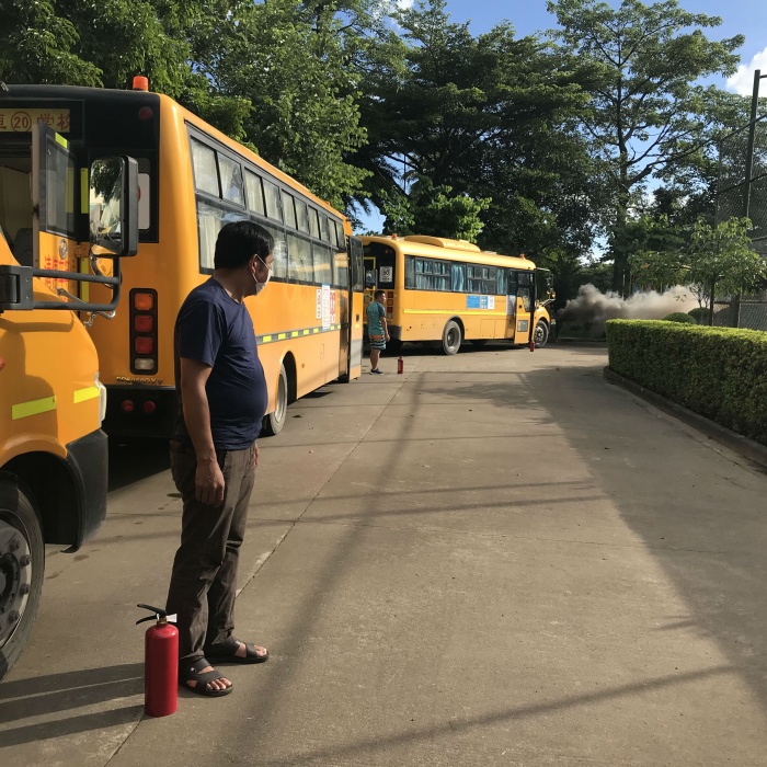隨后,演練正式開始,事先準備在校道上的煙霧彈一一被引燃,很快,十臺校車都浸在滾滾濃煙之中,當(dāng)校車都到達預(yù)定地點時,校車司機與隨車老師互相配合,組織學(xué)生有序地從前門及安全門分頭撤離校車,并按照既定路線疏散到安全地帶。接著,隨車老師迅速清點乘車學(xué)生的人數(shù),確保每個學(xué)生都安全撤離,不遺漏一人。最后,葉寶山主任對此次演練進行了點評,對同學(xué)們的認真、嚴肅對待演練的態(tài)度和表現(xiàn)表示了肯定。