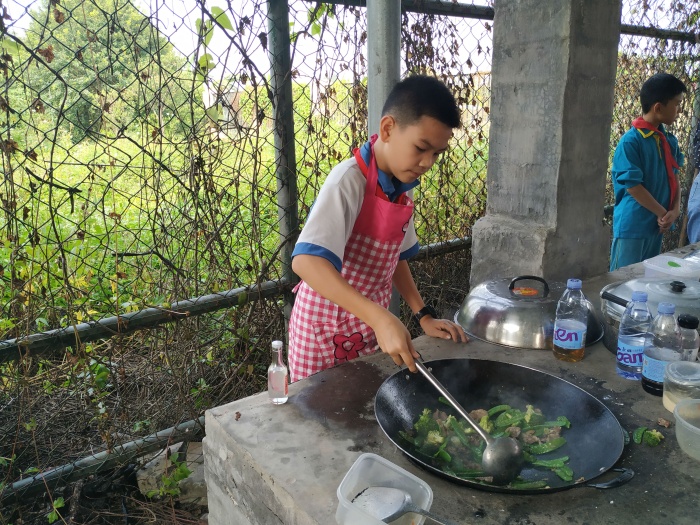 廚藝大賽由五、六年級的隊員參加,每中隊選出6名隊員代表中隊參賽。學校為參賽選手準備爐灶1個,鍋1個、煲1個、鍋鏟1只、砧板1塊、篩1個、盆1個、刀1把,柴若干。參賽選手們在兩節(jié)課時間內(nèi),完成規(guī)定的五道菜肴,其中有1個是小吃、甜品或者涼拌菜,并為每個菜寫上有創(chuàng)意的菜名,9組選手同時進行。宣布比賽正式開始后,選手們馬上擺開食材,開始制作美食。大家團結(jié)合作,忙得不亦樂乎。在規(guī)定時間內(nèi),各小組都捧出了精心制作的色香味俱全的菜肴,現(xiàn)場彌漫著誘人的香味,各位評委和觀眾們都迫不及待的想去品嘗這些菜肴。