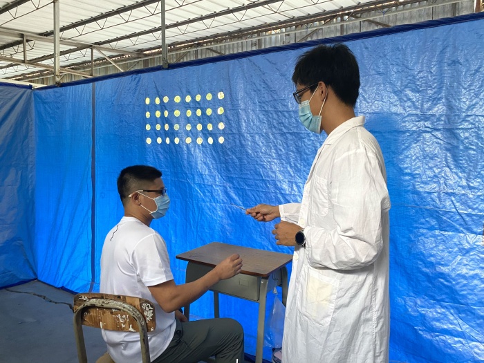 在體溫監(jiān)測演練過程中,發(fā)現(xiàn)了一名體溫超過37.3度,身體不適的疑似癥狀“學(xué)生”。引導(dǎo)老師迅速引導(dǎo)至健康觀察室,再由冼健怡校醫(yī)對其重新測量體溫,并對其身體狀況做初步的判定,仔細(xì)詢問14天內(nèi)有無疫情重點地區(qū)旅居史、途經(jīng)史或有確診、疑似病例接觸史,再進(jìn)行分級上報等各項處置工作,詳細(xì)記錄每個場景中可能出現(xiàn)的意外狀況。