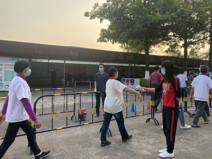 演練正式開始,各個演練項目人員佩戴口罩,各就各位,各司其職。學(xué)校老師扮演的“家長”在家長等待區(qū)聚集,學(xué)校老師進(jìn)行疏散。接著,“學(xué)生們”陸續(xù)來到了學(xué)校門口,排隊等候測溫。體溫檢測老師檢查學(xué)生是否佩戴口罩,并保證人與人之間間隔1米,對學(xué)生逐一進(jìn)行體溫監(jiān)測,體溫正常者登記后依次進(jìn)入校園。