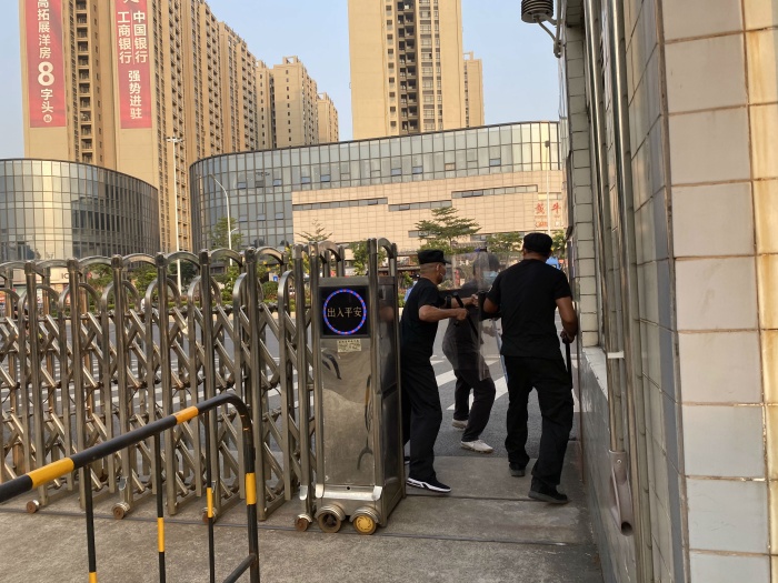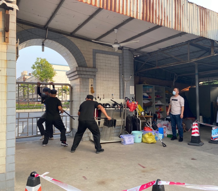 一名由教師扮演的“暴恐分子”企圖騙過門衛(wèi)進(jìn)入校園,被值班保安識破,馬上將其阻止在校門外。隨后,“暴恐分子”翻過欄桿,伺機(jī)沖進(jìn)校園,兩名門衛(wèi)保安立即向前阻止,立即啟動學(xué)校防恐防暴應(yīng)急預(yù)案,當(dāng)值保安與“暴恐分子”周旋、搏斗,最終成功將“暴恐分子”制服,交由及時趕到的派出所警員進(jìn)行處置。