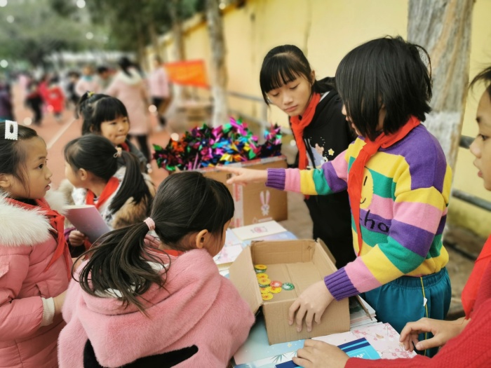 1月8日下午,民眾中心小學少先隊開展了“雛鷹爭章?lián)Q禮物”活動。學校處處都充滿歡笑聲,桌面上堆放著各種禮物,有零食、小動物、學習用品等。隊干們正忙碌地與學生分發(fā)禮品。一張張陽光的、充滿成功與滿足的小笑臉正在綻放,孩子們正在挑選自己喜歡的禮物,每一個孩子都滿載而歸。