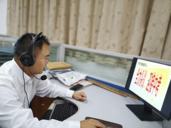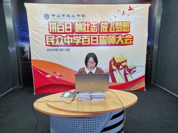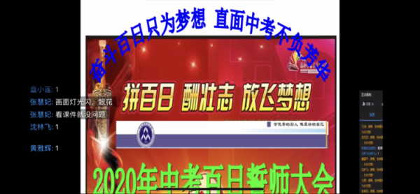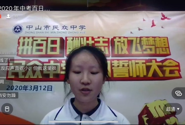 由于新型冠狀病毒肺炎疫情的影響,2020年3月12日晚上,民眾中學召開了一場特殊的線上2020年中考百日沖刺誓師大會,全體畢業(yè)班師生和家長共同參加此次活動,楊盛影級長主持本次大會。