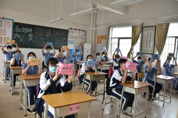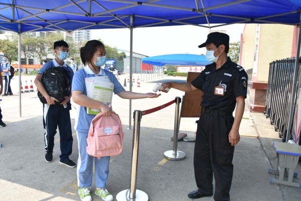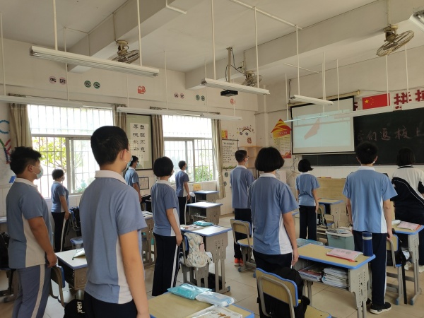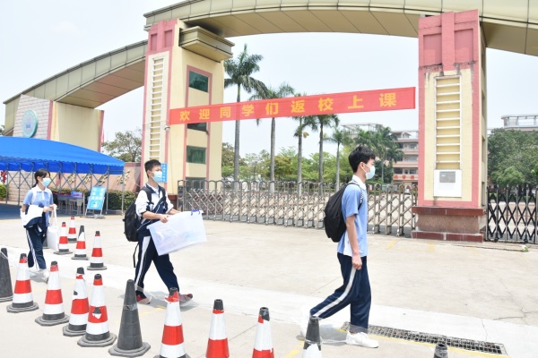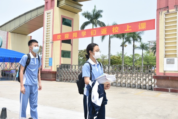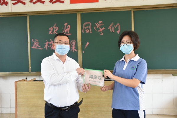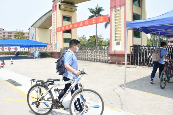 在校門口,有乘坐校車學(xué)生及騎自行車的走讀生錯峰陸續(xù)抵達(dá)校門口,學(xué)生們都能自覺佩戴口罩,保持一米以上的距離有序排隊,依次進(jìn)入體溫監(jiān)測區(qū)域,沒有出現(xiàn)聚集的現(xiàn)象。進(jìn)入校園后,學(xué)生們通過教室專用通道進(jìn)入教室后,整齊地坐在教室內(nèi)進(jìn)行復(fù)學(xué)第一課的學(xué)習(xí)。”復(fù)學(xué)第一課“由中山市第一中學(xué)任山鵬老師擔(dān)任主講。以“天使歸來,英雄開講”為主題,邀請中山市第四批援鄂醫(yī)療隊隊長、中山市人民醫(yī)院ECMO研究室副主任廖小卒;中山市第二批援鄂醫(yī)療隊成員、中山市中醫(yī)院呼吸科醫(yī)師傅進(jìn)藝等醫(yī)護(hù)人員,現(xiàn)場講述中山醫(yī)療隊馳援湖北的驚心動魄的經(jīng)歷。通過中山援鄂抗疫英雄的親身講述,班主任帶領(lǐng)學(xué)生回顧醫(yī)護(hù)人員及全國人民與新型冠狀病毒艱苦斗爭的歷程,從中理解英雄的含義,培養(yǎng)學(xué)生崇敬英雄、學(xué)習(xí)英雄、捍衛(wèi)英雄、關(guān)愛英雄的情感,進(jìn)而感悟國家的強(qiáng)大、人民的團(tuán)結(jié)。同時,通過介紹醫(yī)護(hù)人員精湛的醫(yī)術(shù),引導(dǎo)學(xué)生明白刻苦學(xué)習(xí)是奉獻(xiàn)社會的重要基礎(chǔ),從而增強(qiáng)學(xué)生的社會責(zé)任感?!睆?fù)學(xué)第一課“結(jié)束后,學(xué)校還組織初三學(xué)生進(jìn)行了防疫實操演練,包括洗手、用餐等。此外,在復(fù)學(xué)的第一天,每一位返校的初三學(xué)子都收到了一個特殊而又溫暖的禮物——健康包,這是由中山市民眾鎮(zhèn)政府贈送給學(xué)生的,希望它能給同學(xué)們帶來平安與健康。